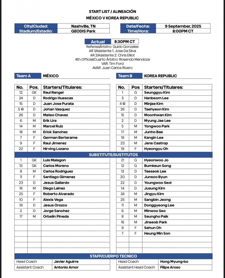 9月10日讯 北京时间今天9点30分,墨西哥将在友谊赛中对阵韩国,两队首发名单出炉。墨西哥首发12-兰格尔、24-韦斯卡斯、15-普拉塔、5-约翰-...