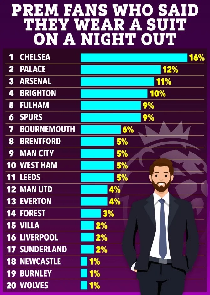 9月29日讯 《太阳报》报道,根据一项最新调查,切尔西球迷是英超联赛中最喜欢在夜晚穿西装外出的群体。数据显示,有16%的切尔西球迷会在重...