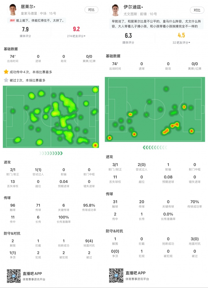 10月23日讯 欧冠联赛阶段第3轮,皇马主场1-0尤文,居莱尔与伊尔迪兹均首发出场74分钟被换下,居莱尔当选MVP,伊尔迪兹被打全场第二低分。